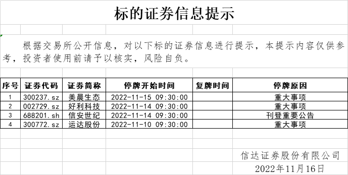 标的证券信息提示(2022-11-16)