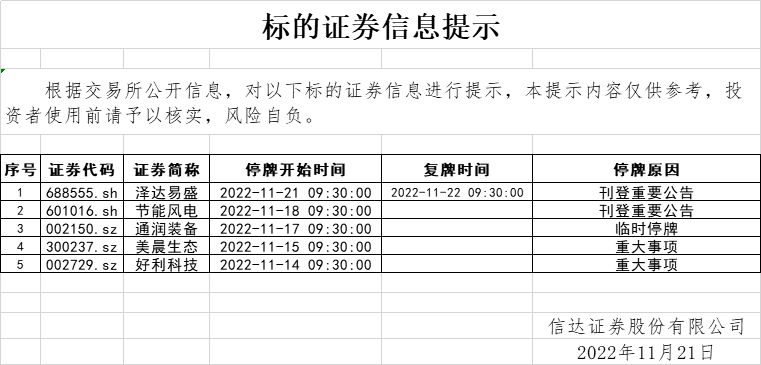 标的证券信息提示(2022-11-21)