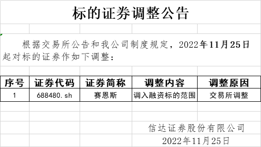标的证券调整公告(2022-11-25)