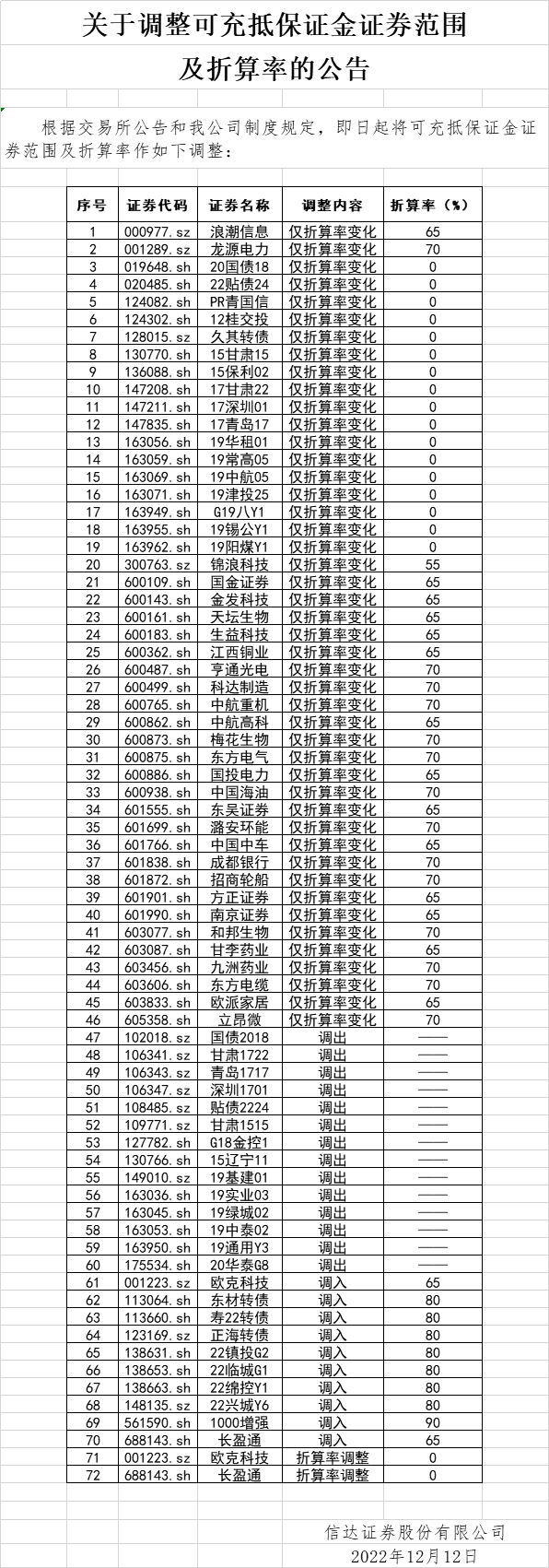 可冲抵保证金证券折算率批量调整公告(2022-12-9)