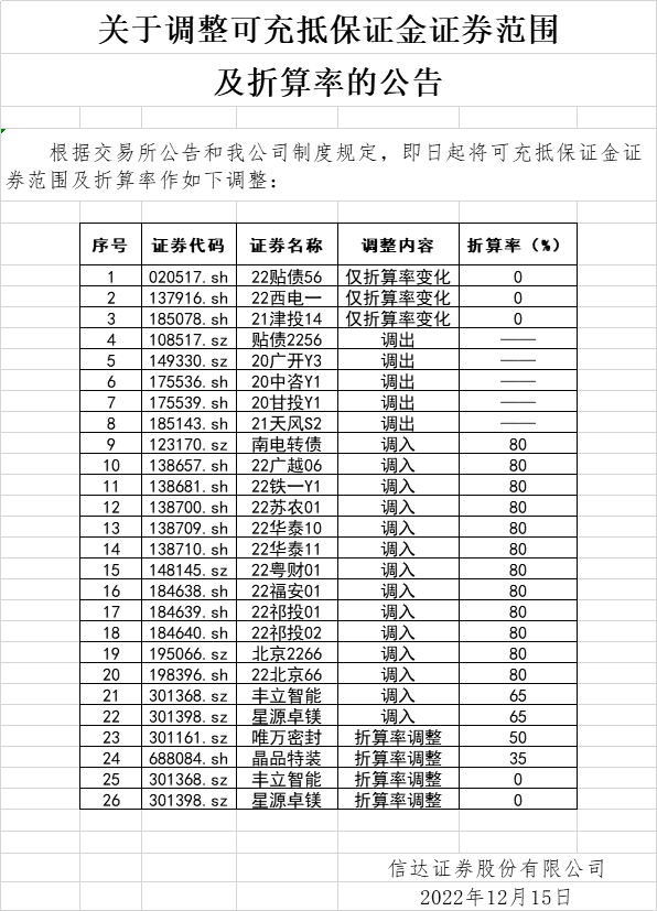 可充抵保证金证券调整公告(2022-12-15)
