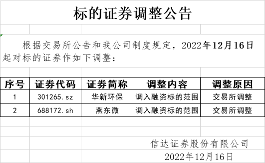 标的证券调整公告(2022-12-16)