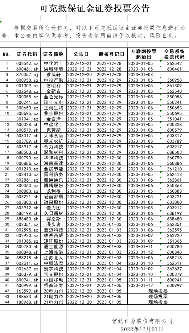可充抵保证金证券投票信息(2022-12-21)