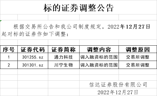 标的证券调整公告(2022-12-27)