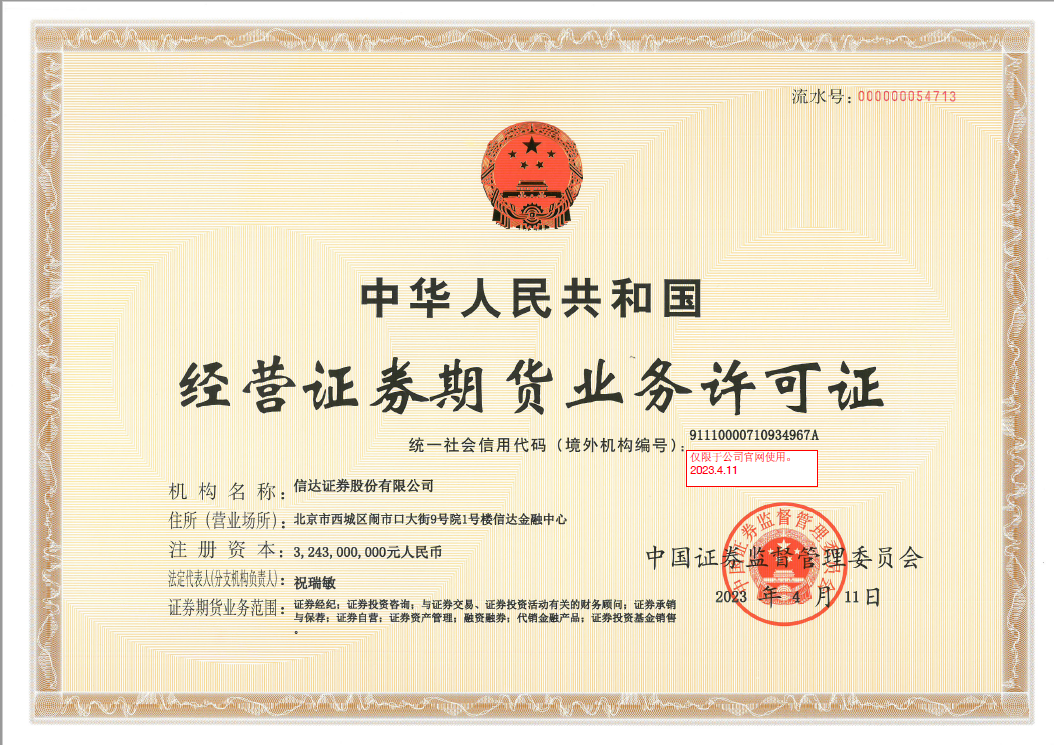公司是由中国信达、中海信托、中国中材共同发起设立的股份有限公司。2007年9月3日,中国证监会下发《关于同意信达证券股份有限公司开业的批复》(证监机构字[2007]211号),同意信达证券开业。2007年9月4日,公司取得国家工商行政管理总局核发的《企业法人营业执照》(注册号:1000001004114(4-1)),注册资本为151,100万元。